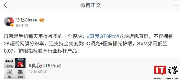 IT之家10月5日消息,真我realme副总裁、全球营销总裁、中国区总裁徐起今日发文称屏幕是手机每天用得最多的一个模块。他透露,真我GT8Pro手机的这块旗舰直屏拥有2K超视网膜分辨率,同时支持全亮度类DC调光+圆偏振光护眼,SVM频闪0.07,号称“护眼指标看齐行业标杆产品”。